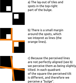 How does this illusion work? According Michael Bach (who's website, incidentally, contains an impressive collection of optical illusions) this is unclear. Kitoaka has a book on optical illusions, which might contain the secret, but I don't have this book in my possession and, at any rate, it's Japanese. So I will venture a guess. I think it has to do with the fact that we tend to see lines in everything. If we consider, for example, the squares in the top-right part of the checkerboard, the pattern looks like (a) in the figure below. Because we tend to interpret the margin around the small white spots as lines (b) and because these perceived lines are not perfectly aligned, we perceive a slight tilt (c). By cleverly positioning the small dots differently in different quadrants of the checkerboard, the whole checkerboard appears to be bulging!