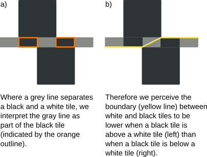 However, the question remains why defective “border-locking” (as Gregory and Heard call it) results in the particular illusion that we observe. One possibility is that a grey line separating a black and a white tile is taken to be part of the black tile, rather than neutral blur (see (a) in the figure below). Therefore, when a black tile is above a white tile, we observe the boundary between the tiles to be lower than when a black tile is below a white tile (b). In turn, this may cause us to perceive the boundary between tiles as slightly tilted.