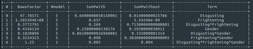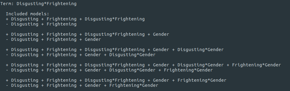 Disgusting × Frightening. - Find all models that contain the effect of interest, but no interactions with the effect of interest. Let's call these the with models. Here, this means all models with the