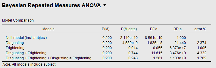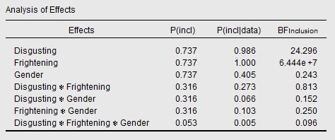 You probably didn't get the preceding sentence. So let's rephrase: The Inclusion Bayes Factor for Disgusting × Frightening not only reflects the evidence for this interaction, but also for the main terms Disgusting and Frightening.