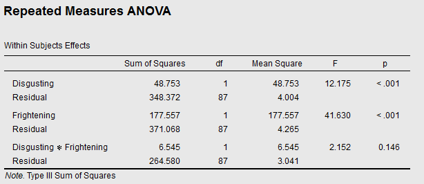If you do the maths, the resulting Baws Factor for Disgusting × Frightening is 0.377. This is re-assuringly close to the result that we got for this interaction in the two-way Repeated Measures.
