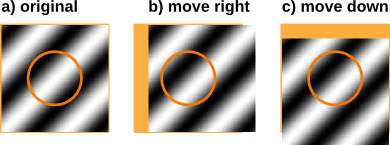 In the figure you see an orange circle which indicates the receptive field of a hypothetical neuron. That is, we assume that there is some neuron which 'sees' only the area inside the orange circle. You can see that the area inside the circle is the same after a rightwards shift (b) and a downwards shift (c). Therefore, our hypothetical neuron will not be able to distinguish a rightwards shift (due to rotation) from a downwards shift (which will occur if we approach the image). This may explain why we confuse a downwards shift with a rightwards shift and, thus, perceive the circles to rotate when we approach the image.