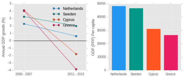 Left: Pre- and post-crisis GDP growth rates for Sweden, The Netherlands, Cyprus, and Greece. Right: Post-crisis per capita GDP corrected for purchasing power. Data from the World Bank.