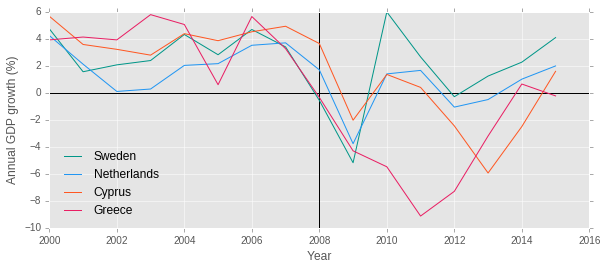 The eurocrisis hit somewhere around 2008. The result was that the entire eurozone saw their Gross Domestic Product (GDP) decline for a little while. The figure below shows data from two rich (Sweden and The Netherlands) and two poor (Cyprus and Greece) member states. The onset of the eurocrisis is visible as a dip around 2009.