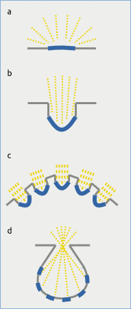 So what happened in between? There is no fossil evidence, but it's a good bet that the first “eye” was simply a light sensitive patch on the body of some lucky mutant (see (a) in the figure on the right). Of course, such a patch offers very little in terms of resolution and directionality …